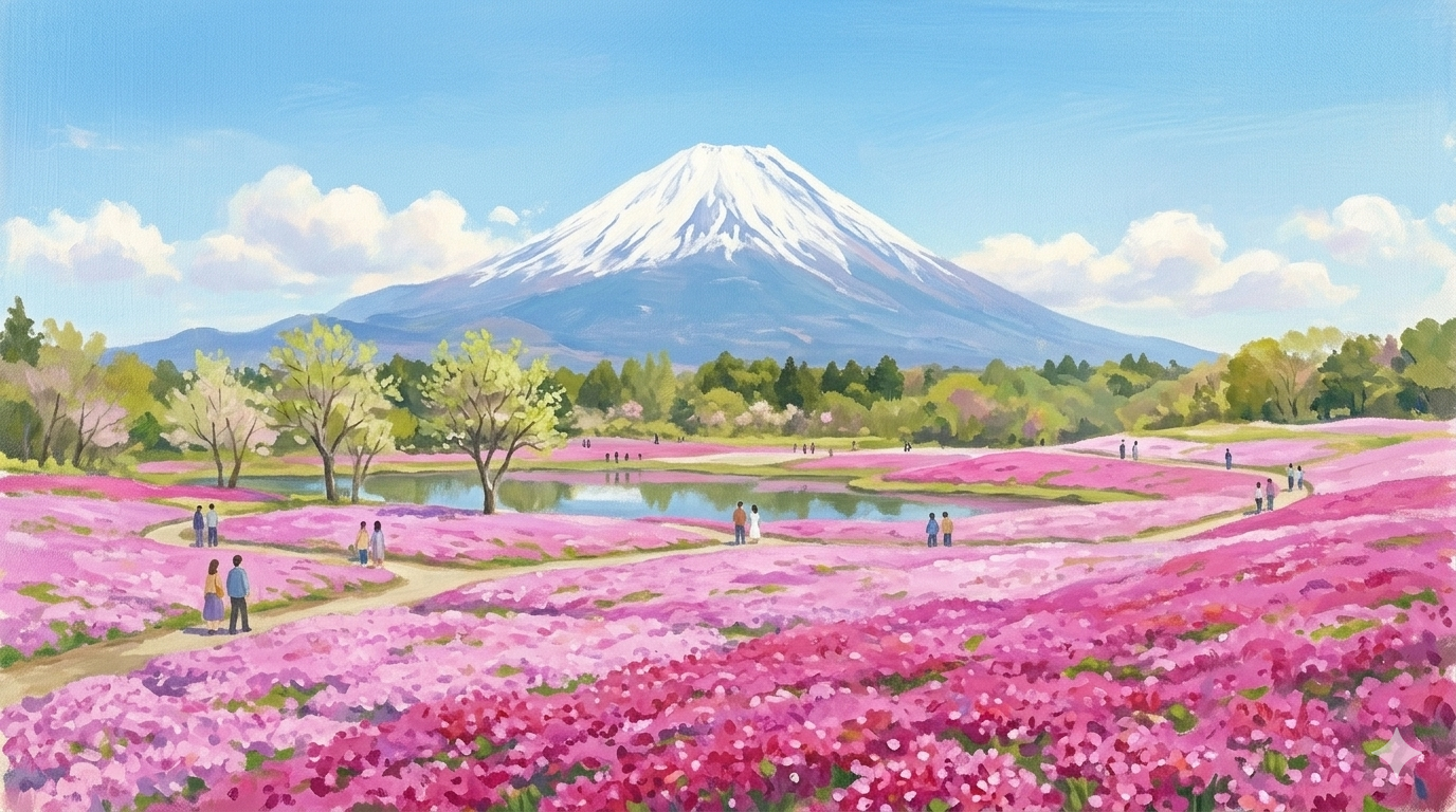 春の富士五湖エリアを彩る最大のイベントといえば「富士芝桜まつり」です。残雪の富士山と、足元に広がる鮮やかなピンク色の芝桜。このコントラストは、まさに日本を代表する絶景の一つと言えます。